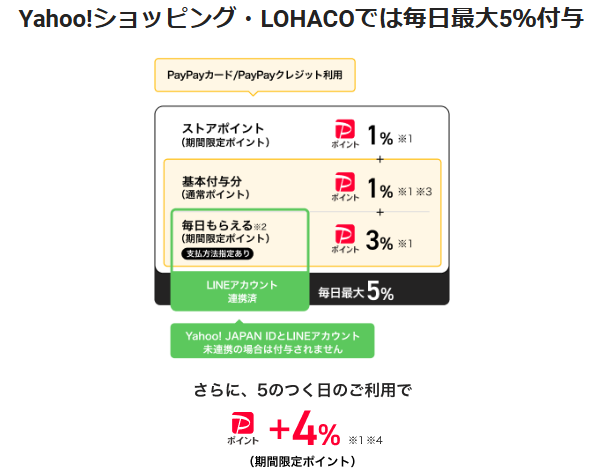 メリット③ Yahoo!ショッピング・LOHACOでは毎日最大5%付与