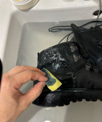 ぬるま湯を溜めて、靴を10分ほど浸けおきます。