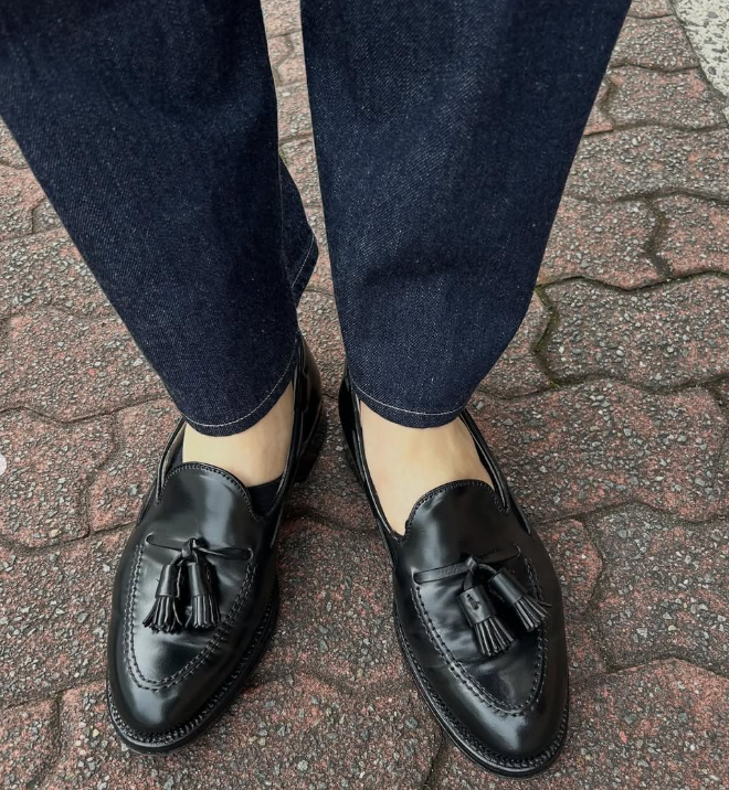 足元はALDENのタッセルローファー。生成りのステッチとの相性が良すぎる。